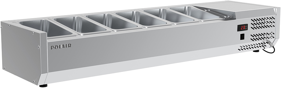 Холодильная витрина POLAIR VT2EN 1/3 предназначена для демонстрации, охлаждения и кратковременного хранения ингредиентов для пиццы и салатов на предприятиях общественного питания и торговли. Обшивка корпуса шкафа изготовлена из нержавеющей стали и обеспечивает механическую прочность и долговечность витрины. Оборудование рассчитано на работу при температуре окружающей среды до 32 °C и относительной влажности воздуха до 80%.